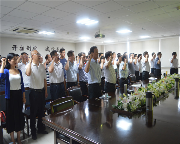 會(huì)議進(jìn)行第一項(xiàng),全體人員起立,唱國(guó)歌。嘹亮高昂的義勇軍進(jìn)行曲響徹整個(gè)會(huì)議室、整個(gè)集團(tuán)公司,歌聲振奮同志們的意志,更加堅(jiān)定了對(duì)黨的信仰。