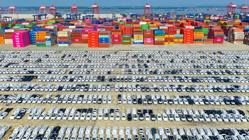 2025年10月4日在江蘇省港口集團(tuán)南京港龍?zhí)陡蹍^(qū)拍攝的準(zhǔn)備裝船出口的汽車(chē)(無(wú)人機(jī)照片)。新華社發(fā)(楊素平?攝)