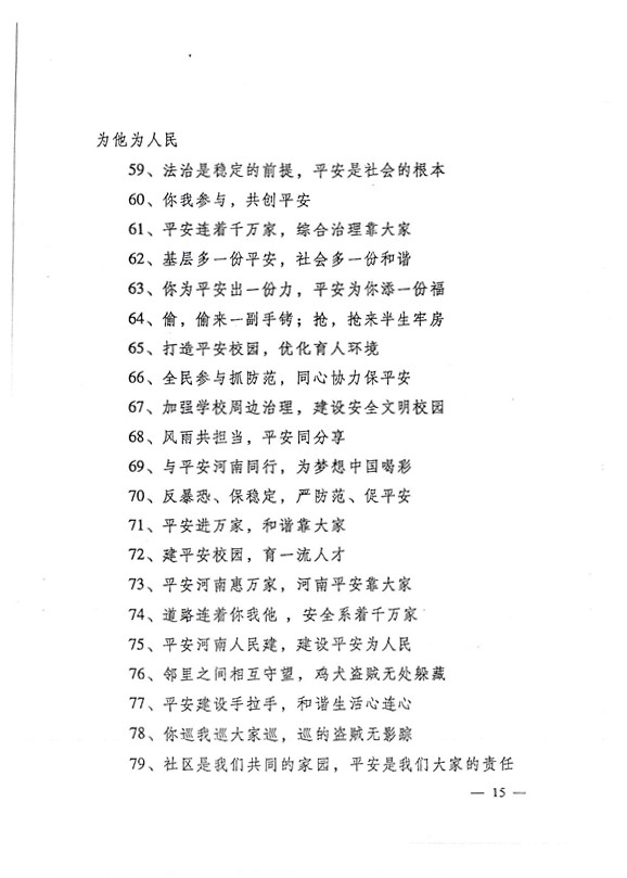 平安兩字重千斤,社會穩(wěn)定得民心。 創(chuàng)建平安人人有責(zé),構(gòu)建和諧人人參與。